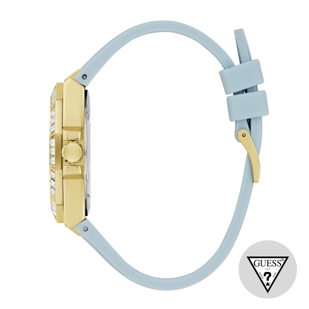 Hộp đồng hồ analog màu vàng và trắng, Kết nối vấu màu vàng và vành tròn với các chi tiết trang trí bằng pha lê, Mặt số màu trắng bóng bẩy, Số La Mã theo quý và các vạch chỉ giờ tối giản, Dây đeo silicon màu trắng với khóa cài, Dây đeo bằng da thật màu xanh lam nhạt đi kèm với khóa cài, Đường kính vỏ tính bằng mm: 34, Chống nước ở độ sâu lên đến 50 m/160 ft